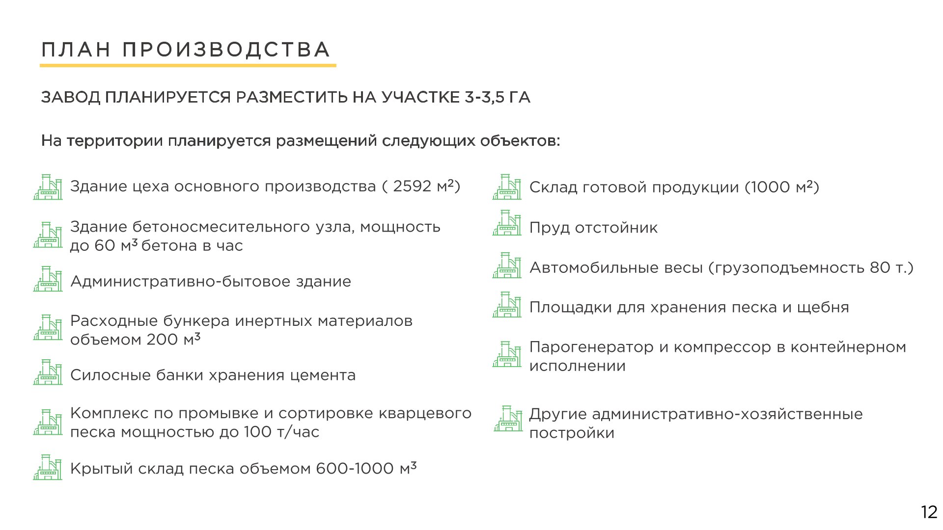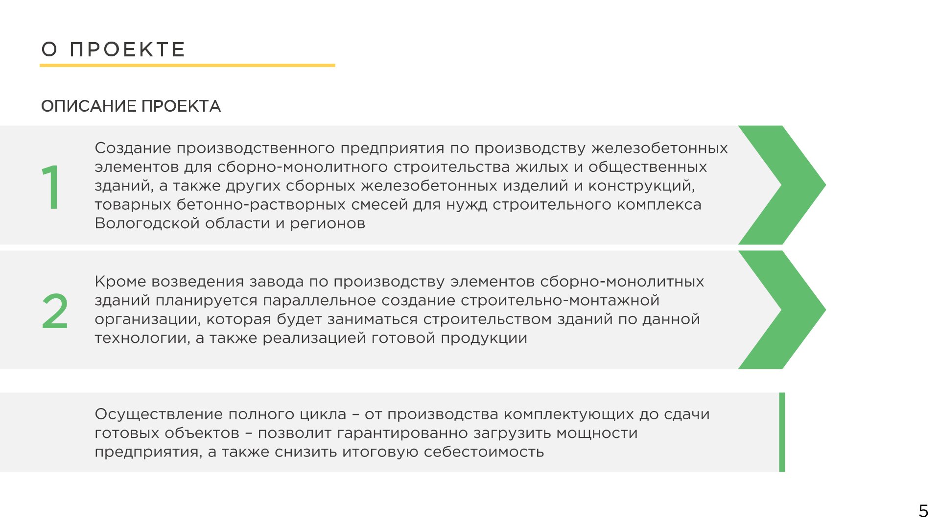 Создание производственного предприятия по производству железобетонных элементов для сборно-монолитного строительства жилых и общественных зданий, а также других сборных железобетонных изделий и конструкций, товарных бетонно-растворных смесей для нужд строительного комплекса Вологодской области и регионов.